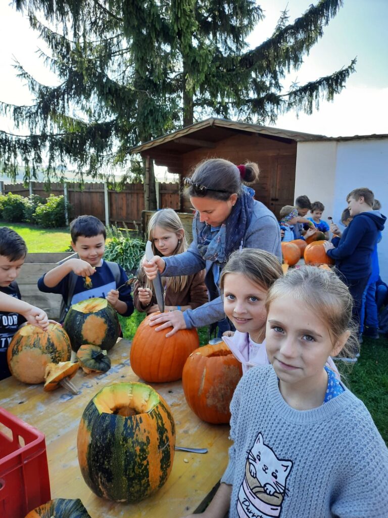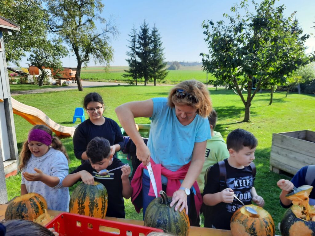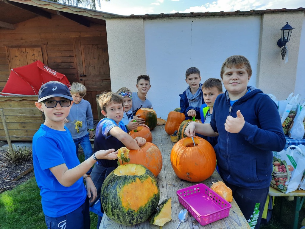 Die 1. und 2. Klasse haben dann ihren Kürbis angemalt. Die 3. und 4. Klasse haben ihren Kürbis ausgehöhlt und gruselige Gesichter geschnitzt.