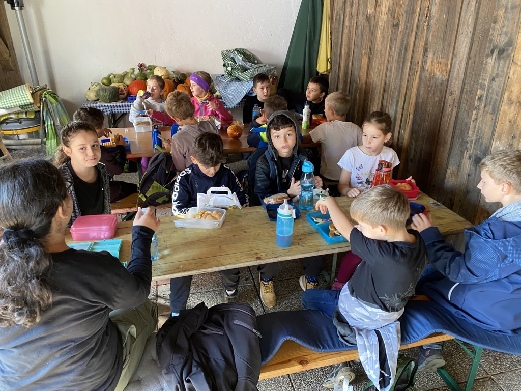 Am Hof der Familie machten wir eine kurze Pause. Danach durfte jedes Kind einen großen Kürbis aussuchen.
