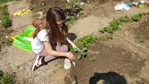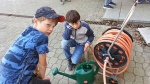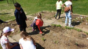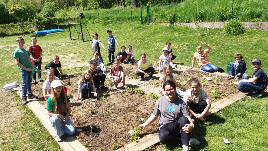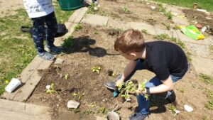 Die Kinder haben im Februar begonnen, ihr Lieblingsgemüse an der Fensterbank vorzuziehen. Danach wurde einiges über Mischkulturen, Pikieren und Einteilung eines Beetes gelernt. Das zeitige warme Wetter hat uns vor einigen Tagen ermutigt, die zarten Pflänzchen ins Beet zu setzen. Seitdem wird kräftig gegossen, gejätet und gestützt. Die Kinder haben viel Freude dabei zuzusehen, wie sie aus einem Samenkorn eine Frucht zum Tragen bringen können.