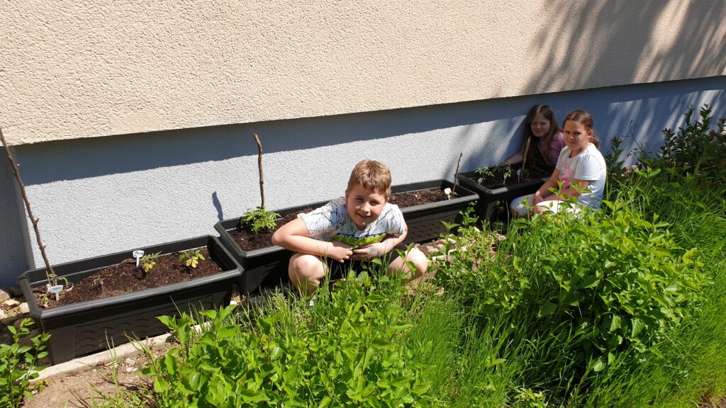 Die Kinder haben im Februar begonnen, ihr Lieblingsgemüse an der Fensterbank vorzuziehen. Danach wurde einiges über Mischkulturen, Pikieren und Einteilung eines Beetes gelernt. Das zeitige warme Wetter hat uns vor einigen Tagen ermutigt, die zarten Pflänzchen ins Beet zu setzen. Seitdem wird kräftig gegossen, gejätet und gestützt. Die Kinder haben viel Freude dabei zuzusehen, wie sie aus einem Samenkorn eine Frucht zum Tragen bringen können.