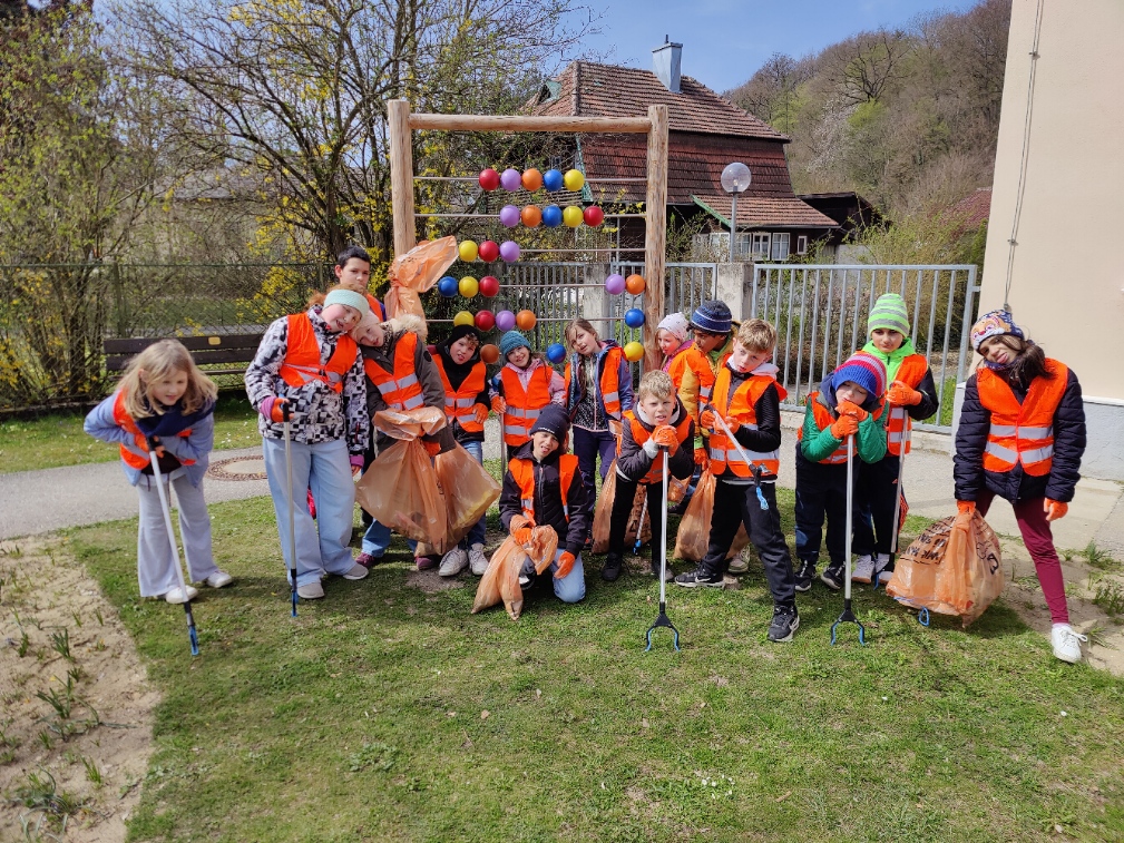 Am Freitag vor den Osterferien machten sich die Kinder der 3./4. Klasse gut ausgerüstet auf den Weg, um in Unterradlberg den Müll zu beseitigen, der von anderen achtlos weggeworfen wurde. Es wurden schon einige Säcke an der Kreuzung beim Bahnhof stehengelassen, weil sie dort schon so schwer waren. Am Weg zur Schule waren die neuen Müllsäcke wieder voll geworden.