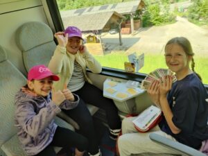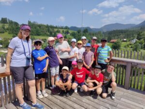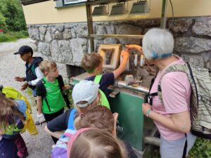 Am dritten Tag freuten sich schon alle auf die Fahrt nach Mariazell zur Bürgeralpe. Nach einem kurzen Fußweg zur Gondel erwartete uns bei der Talstation schon die Waldpädagogin Regina. Mit ihr fuhren wir mit den Gondeln hinauf und bekamen bei der Bergstation einen Überblick zum Tag. Den Start bildete die Erzherzog-Johann-Warte, die wir hinaufstiegen und oben angekommen den Ausblick genossen. Danach führte uns Regina mit interessanten Infos durch das Holzknechtland. Hier durften die Kinder auch das Flößen der Hölzer ausprobieren. Danach gab es eine ausgiebige Jausen- und Spielepause. Nun freuten sich alle schon auf die Fahrt mit dem Basti-Express um die beiden Stauseen. Im Anschluss marschierten wir ins Holzknechtmuseum, in dem die Kinder ausprobieren konnten, wie die Holzknechte früher eine Säge betätigten (Izaduza ). Der Höhepunkt für viele Kinder war nun die Fahrt mit der Waldachterbahn. Alle Kinder waren mutig und glitten durch den Wald zur Endstation. Nachdem alle sicher angekommen waren machten wir uns auf den Weg um die Bürgeralpe hinunter zu gehen. Keines der Kinder beschwerte sich auch nur ein einziges Mal über drückende Schuhe, Schmerzen in den Füßen und sonstige Wehwehchen, sehr tapfer!! Unten angekommen marschierten wir zur Kerzerlgrotte, wo die Kinder eine Kerze anzuzünden konnten, und in die Basilika. Danach hatten die Kinder die Möglichkeit, bei den Standeln eine kleine Erinnerung zu kaufen. Am Weg zur Himmelstreppe blieben wir noch kurz beim Pirker stehen um Lebkuchen einzukaufen.